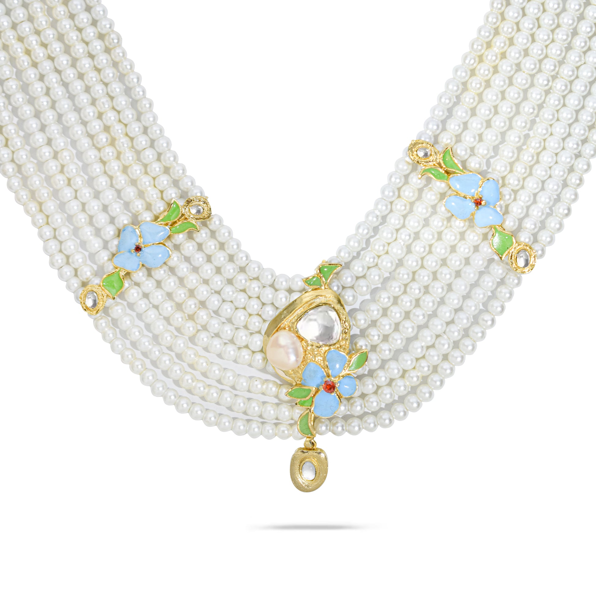 Celeste Shine choker – a luxurious five‑strand pearl necklace that forms a sleek, layered choker shape. Its unique details include delicate enamel blue flowers with green leaves spaced across the strands, gold‑tone connectors, and a central gold clasp featuring a pearl and crystal accent with a dangling teardrop motif.
