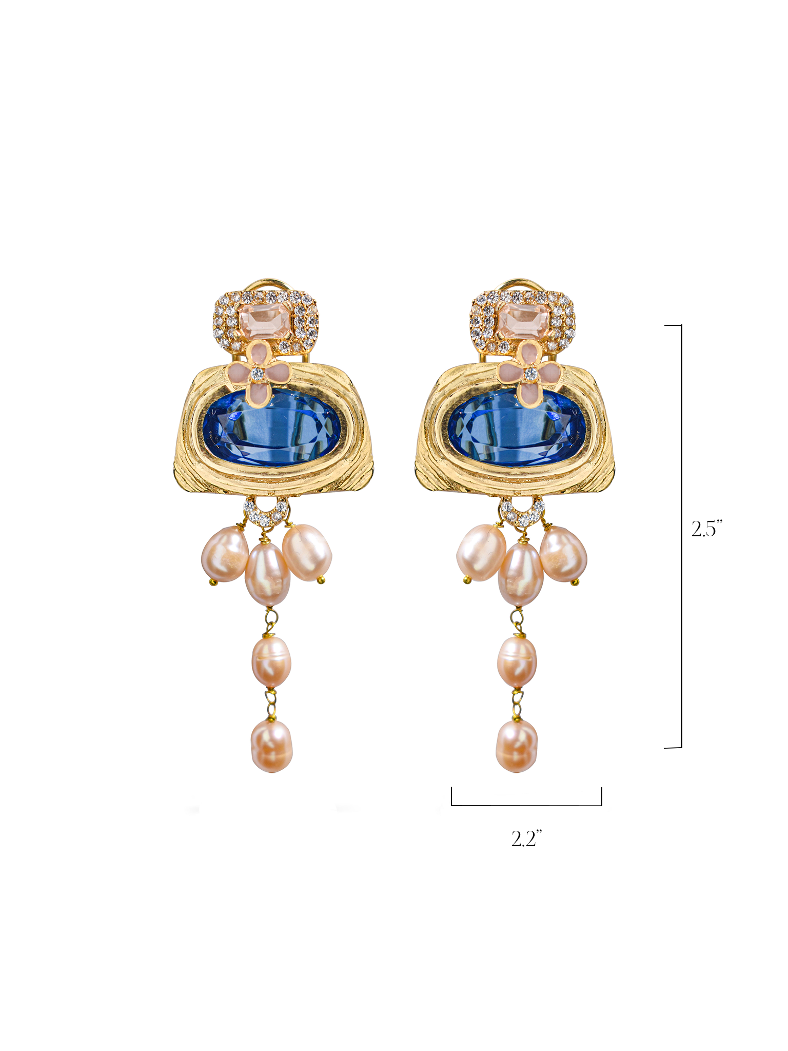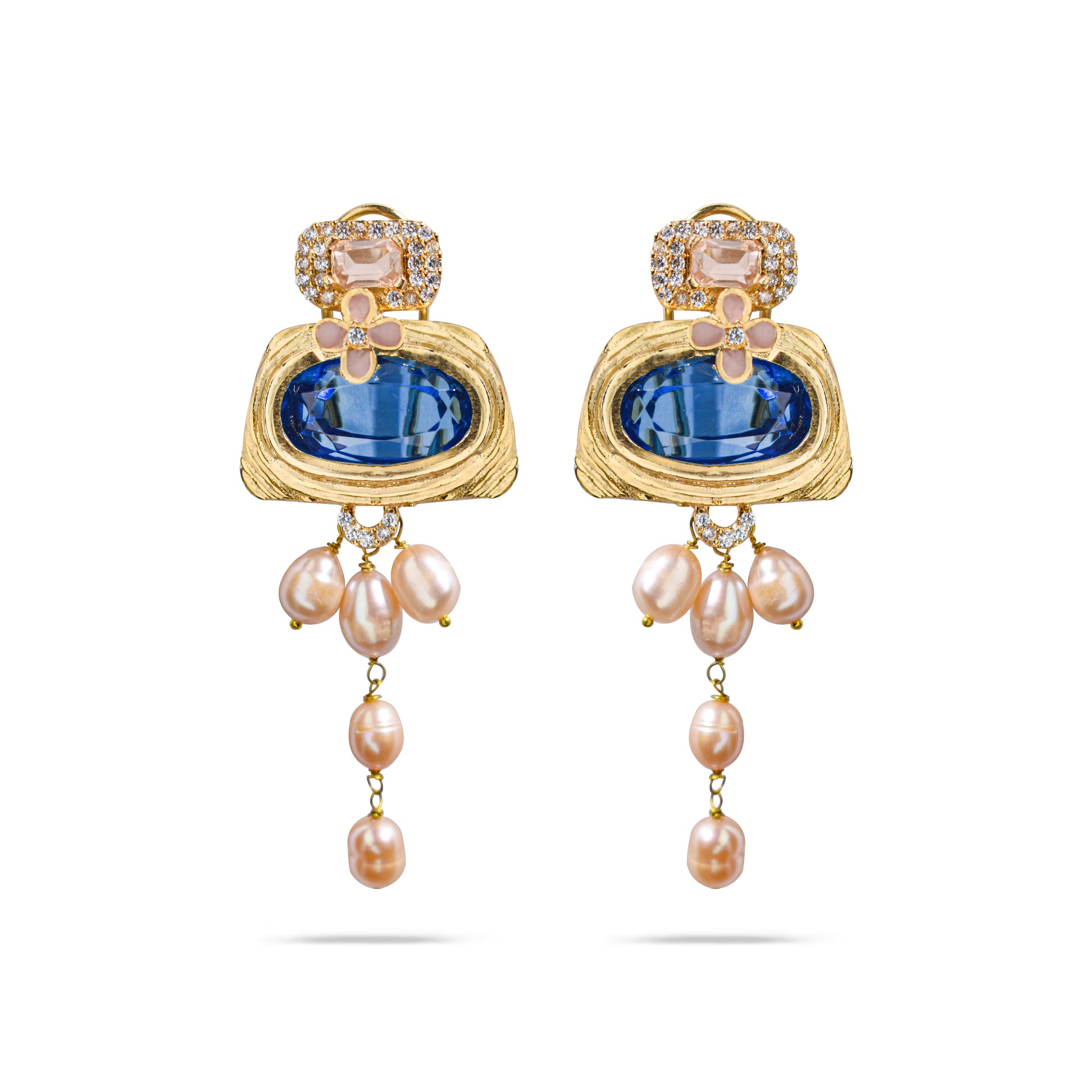 The OG earrings from the Prismatic Affairs collection feature a gold rope-twist frame with a sapphire blue gem and a pink gemstone at the top. A pink floral centerpiece adds whimsy, while five dangling peachy pink pearls create a shimmering effect. Perfect for evening glamour