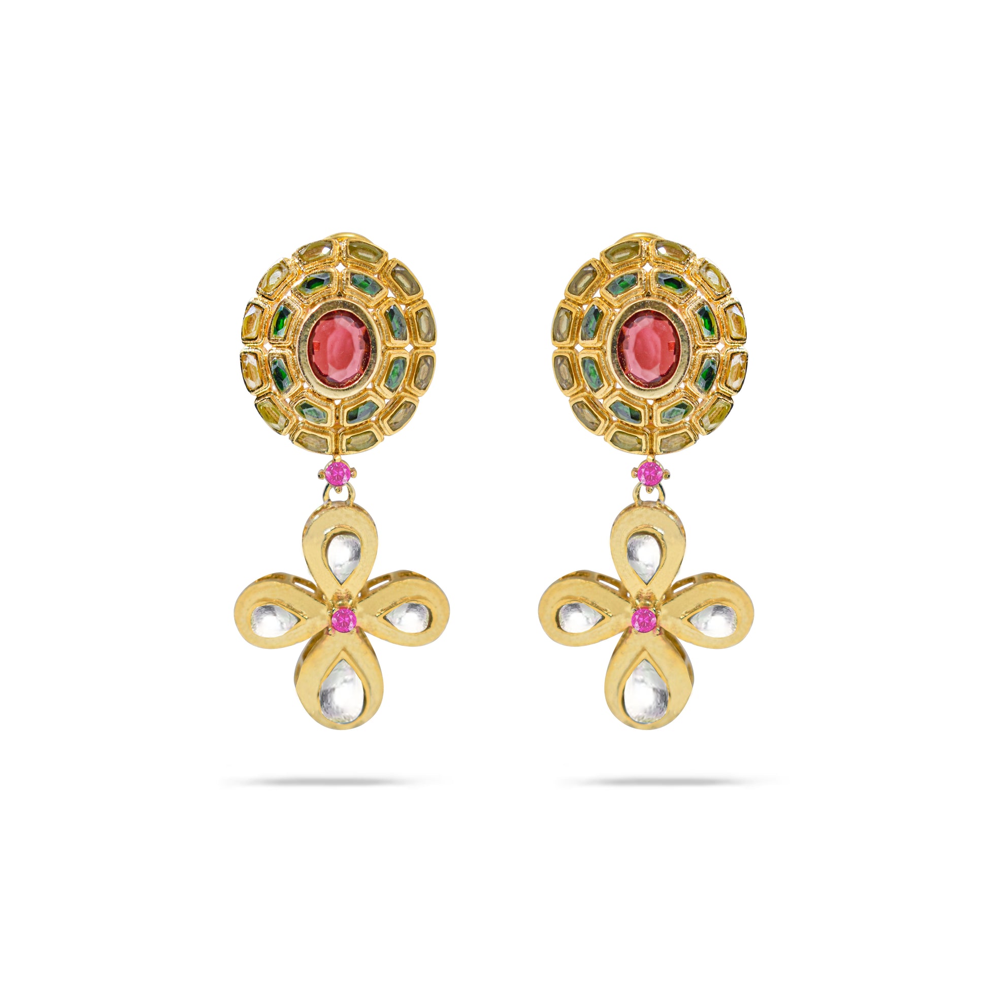 The Olive Aura earrings from the new Prismatic Affairs collection are gold‑tone statement pieces featuring a circular top inset with a vibrant pink cabochon surrounded by emerald‑green mosaic accents, and a dangling four‑petal flower charm set with clear pear‑shaped stones and a pink gem at its center, delivering luxe, colorful elegance.