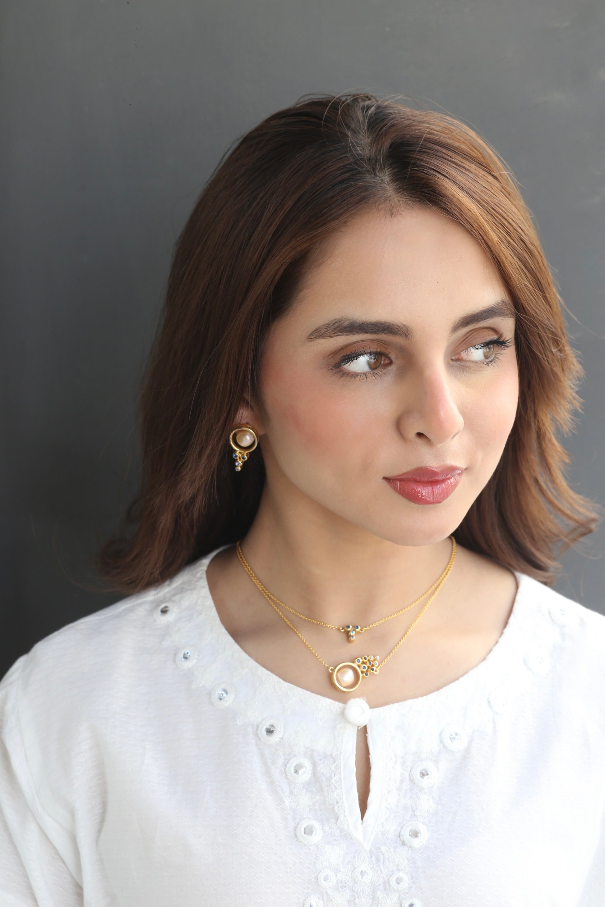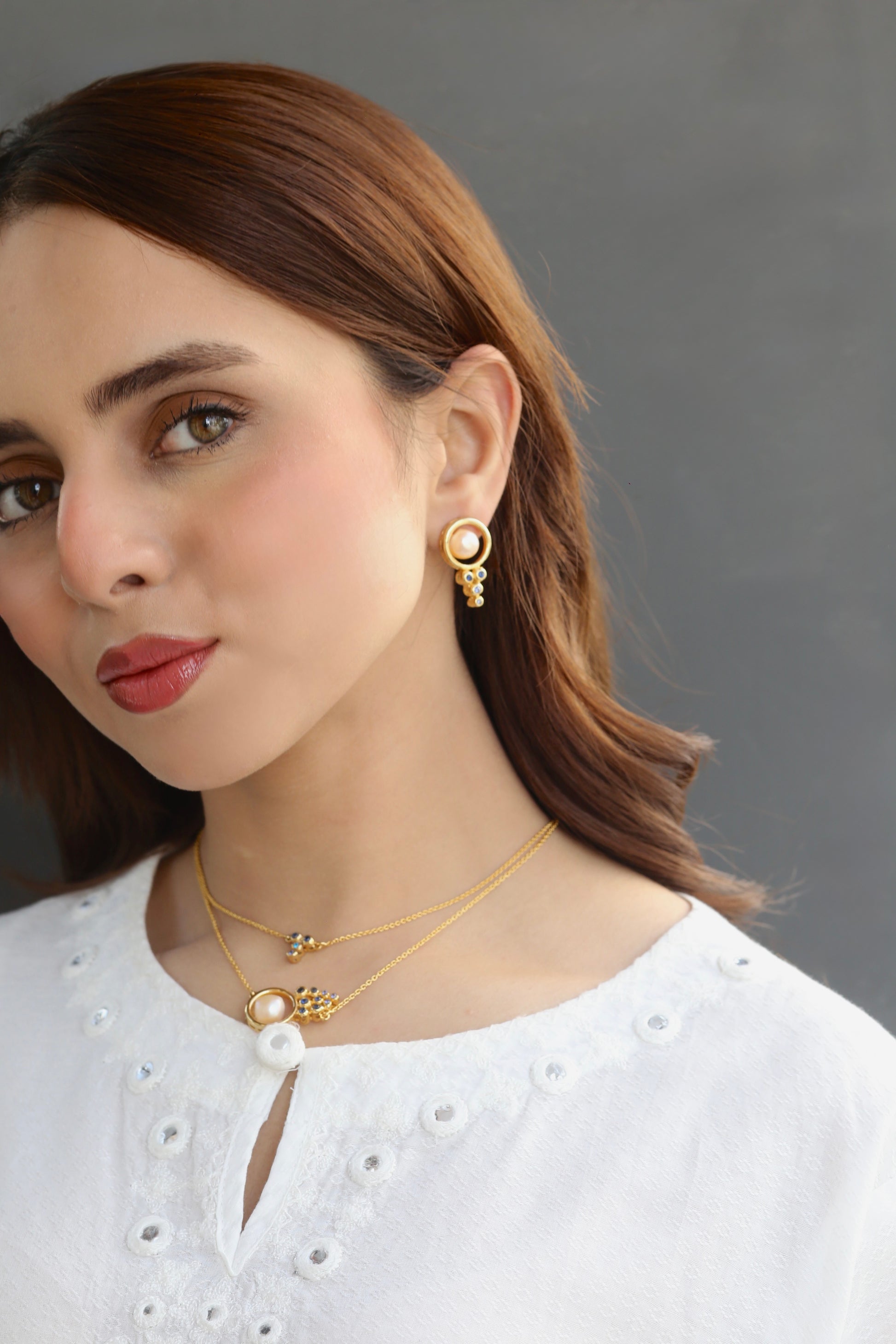 Encircled in polished gold, each earring features a luminous peach-toned pearl cradled inside a sleek open ring. A delicate drop of deep and sky-blue stones cascades beneath, adding movement and a striking contrast to the softness of the pearl. Bold, balanced, and effortlessly eye-catching.