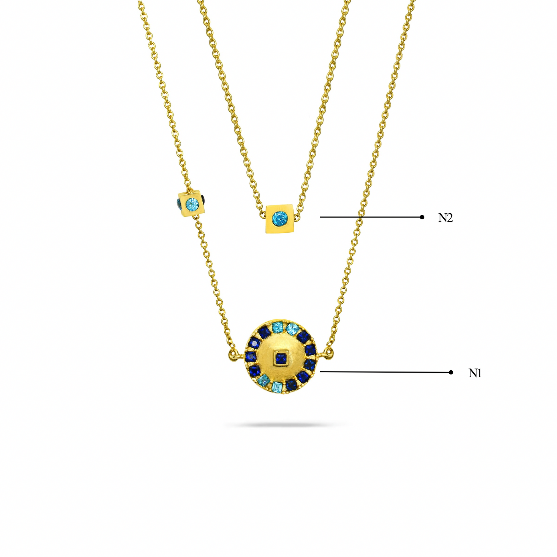 A circular gold pendant detailed with a ring of blue and aqua stones surrounding a square center stone. Balanced and eye-catching, it brings symmetry and sparkle to the neckline.