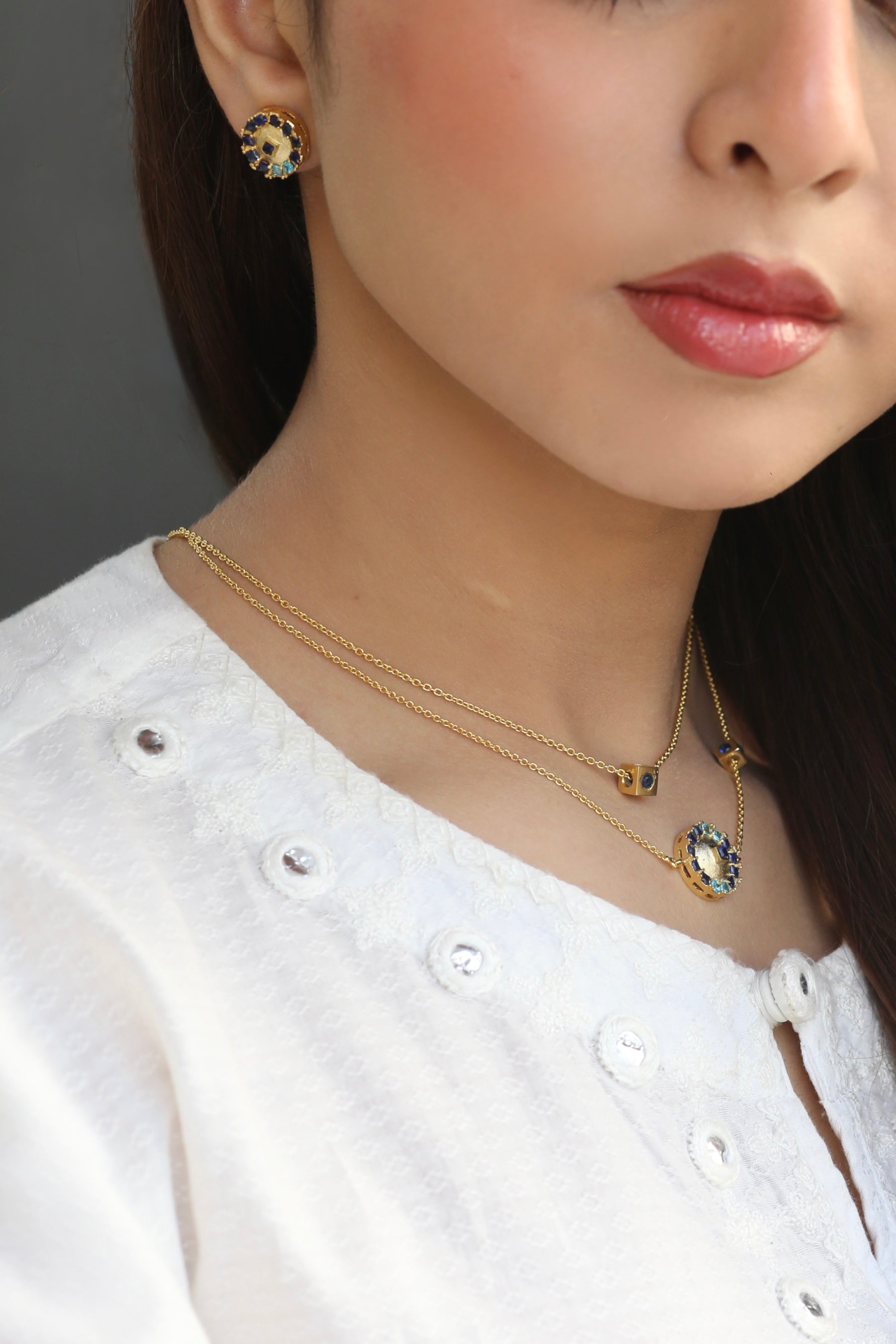 A delicate gold chain featuring a tiny cube charm set with a vibrant blue stone. Clean, modern, and perfect for layering or wearing solo for subtle shine.